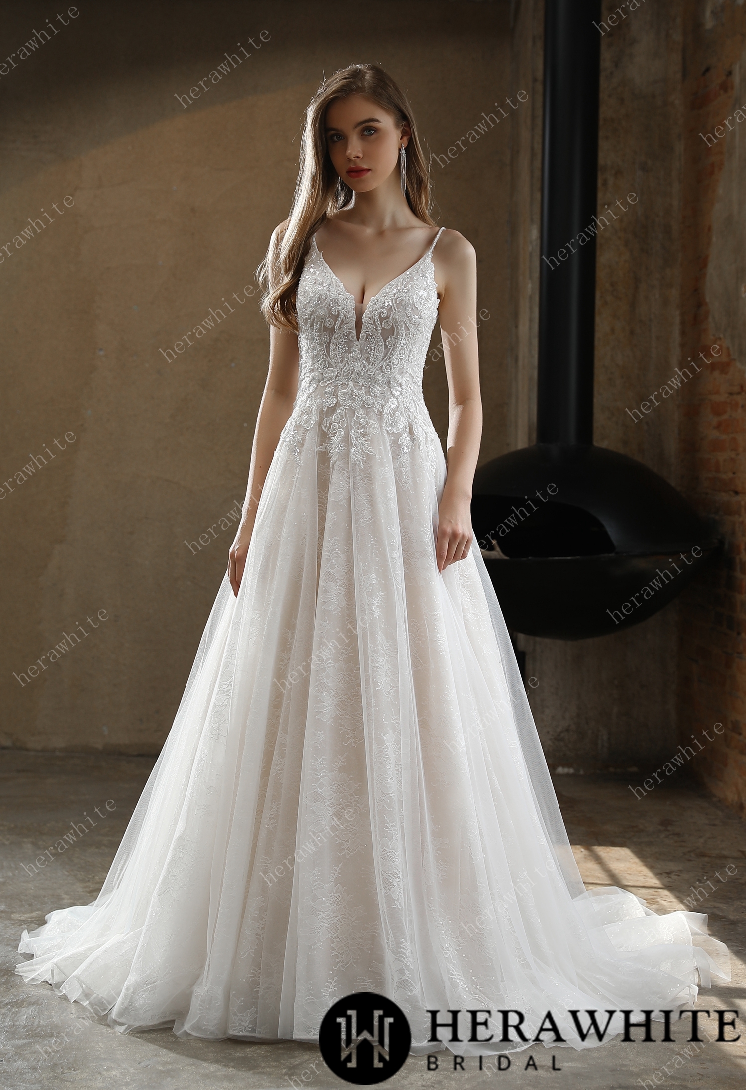 Romantische bruidsjurk met een zachte blush ondertoon.