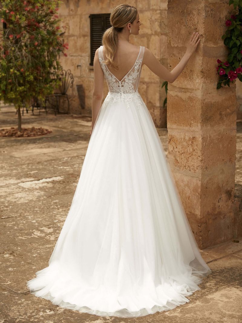 •Princess bruidsjurk •gemaakt van mooie kwaliteit kant en tule •mouwloos •Queen Anne neklijn and V-rug