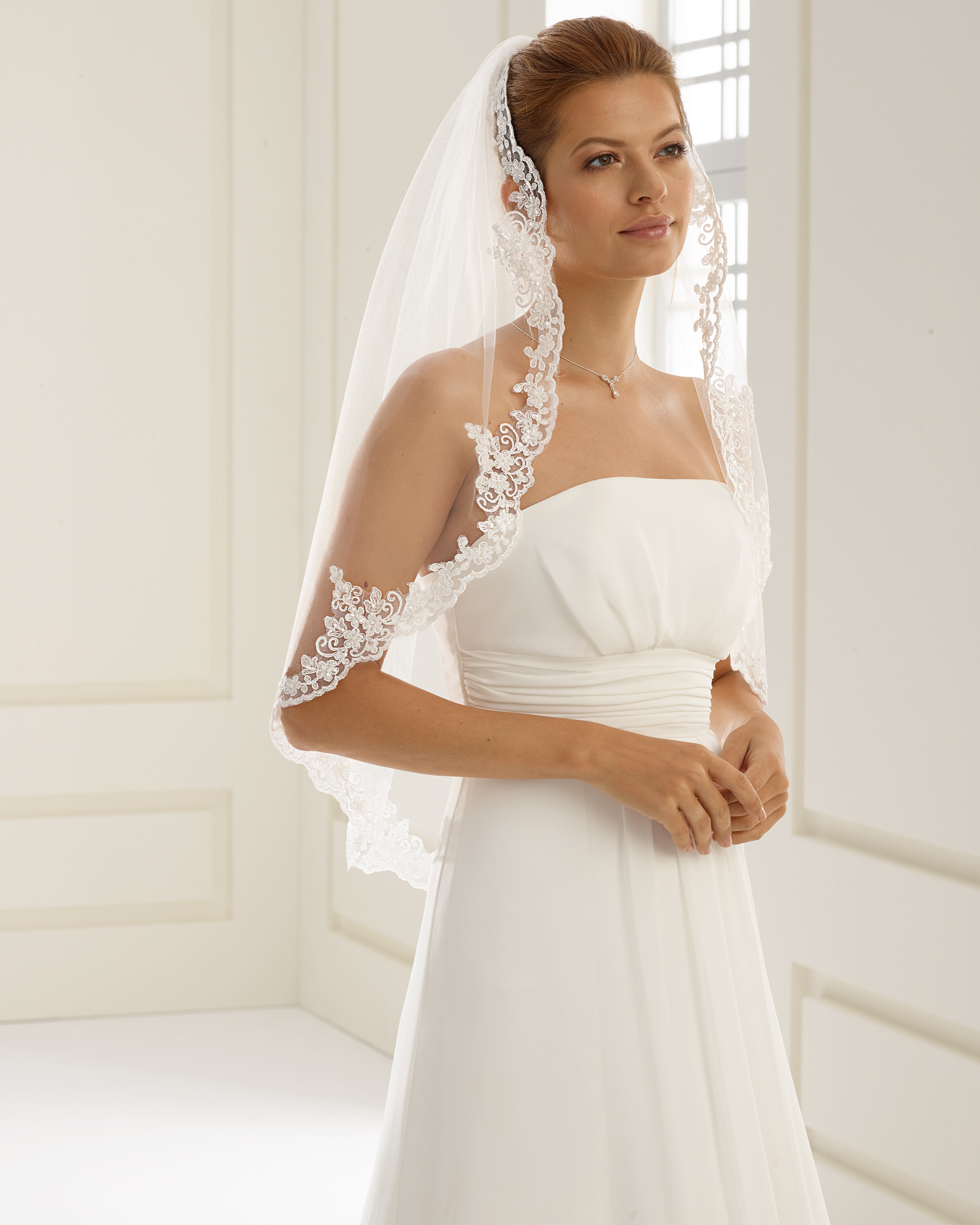 korte sluier met kanten rand met kralen